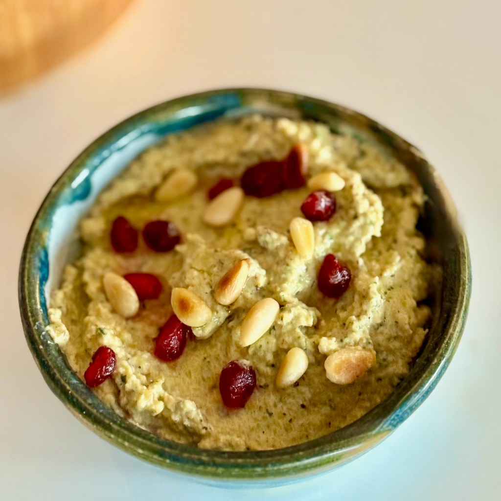 Chill before serving with a sprinkling of toasted pine nuts & pomegranate seeds and a drizzle of olive oil.