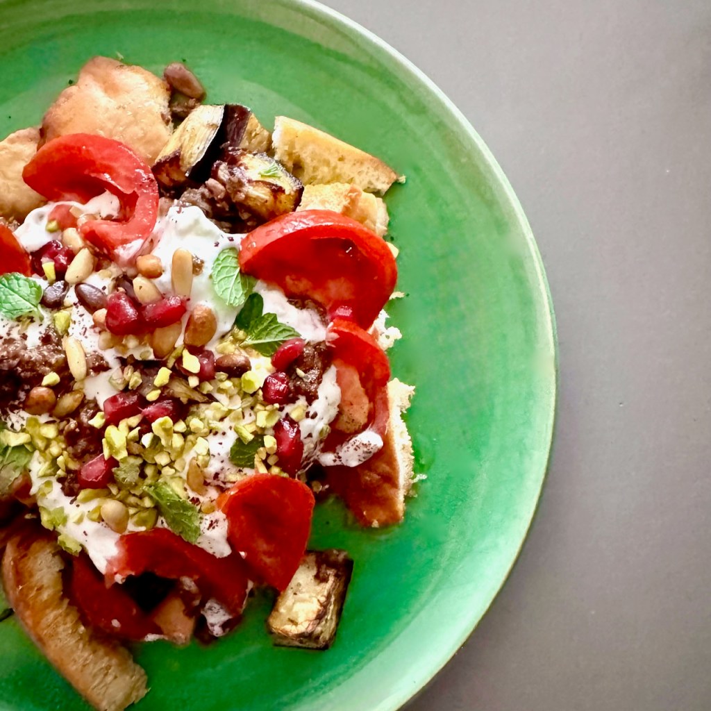 To serve, lay out the crisp pita on two plates and spoon over the lamb-aubergine mix, followed by the garlic yoghurt. Add a few slices of ripe tomato along the edges. Sprinkle with sumac, add a drizzle of olive oil and garnish with the pinenuts, some chopped pistachio, a few pomegranate seeds and some mint and/or parsley leaves. Serve at once.