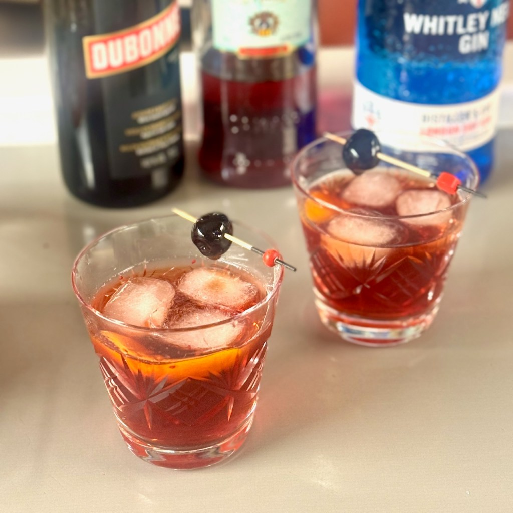 In a cocktail shaker filled with a few ice cubes, pour in 25ml each of gin, red vermouth, and Campari, along with 15ml cranberry syrup. Stir till nicely chilled
