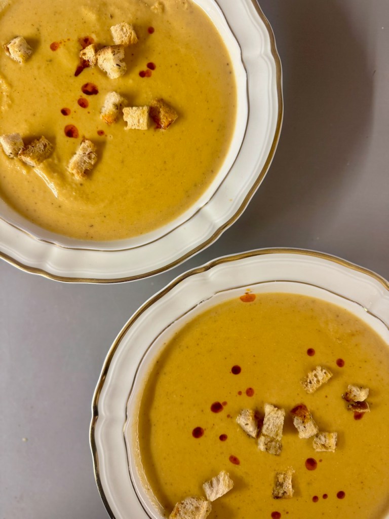 Meanwhile, bring 1 litre of vegetable broth and the reserved chickpea water to a slow simmer, and then add the roasted vegetable mixture. Purée the soup using an immersion blender or a stand blender. At this point, I like to strain the soup through a fine wire mesh strainer for a smoother consistency – but feel free to omit this step for a chunkier soup.