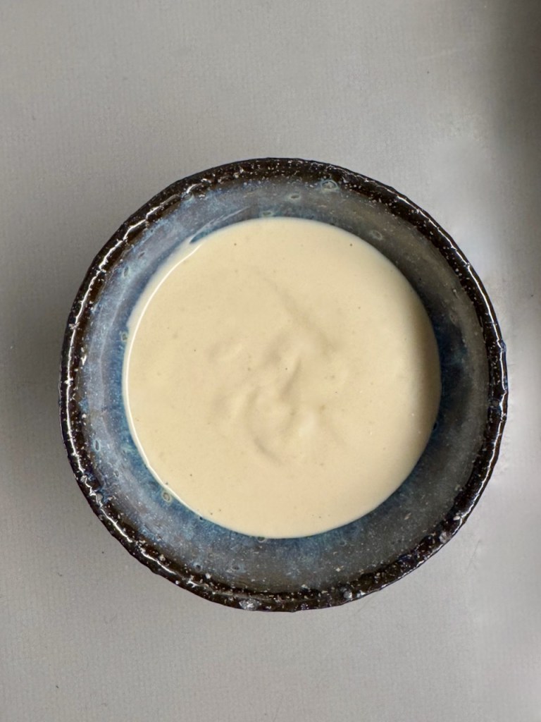In a small mixing bowl, mix together 4 tbsp tahini paste with 2 tbsp lemon juice, 1 small garlic clove, grated, and ½ tsp salt. It will seize up, but don’t worry, that’s normal.
